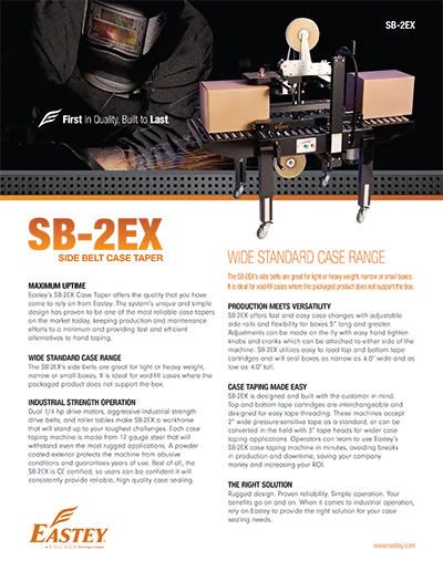 Designed for uniform-sized cartons, the SB-2EX features a dual-side belt drive system that ensures stable, consistent case movement through the sealing process. Its industrial-grade steel construction, adjustable case sizing, and easy operation make it an ideal solution for increasing packaging efficiency while minimizing downtime.