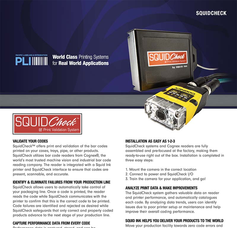 The SquidCheck Print Validation System gives you peace of mind by ensuring every print on your line is present, properly placed, and readable. Designed to work seamlessly with Squid Ink’s entire product line, SquidCheck automatically inspects your codes—catching errors before they leave your facility.